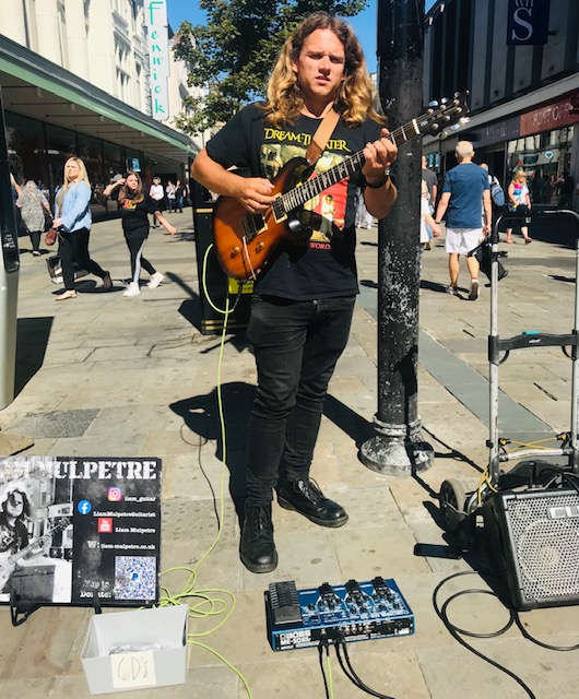 Wonder down Northumberland Street in Newcastle and you’ll find a wall of sound wedged between Fenwick’s and W H Smith. Welcome to the domain of Liam Mulpetre, the Tony Iommi of busking. Liam earns a living from performing on the streets, and from occasional session and live work with Heavy Metal bands around the Newcastle and Durham area.
